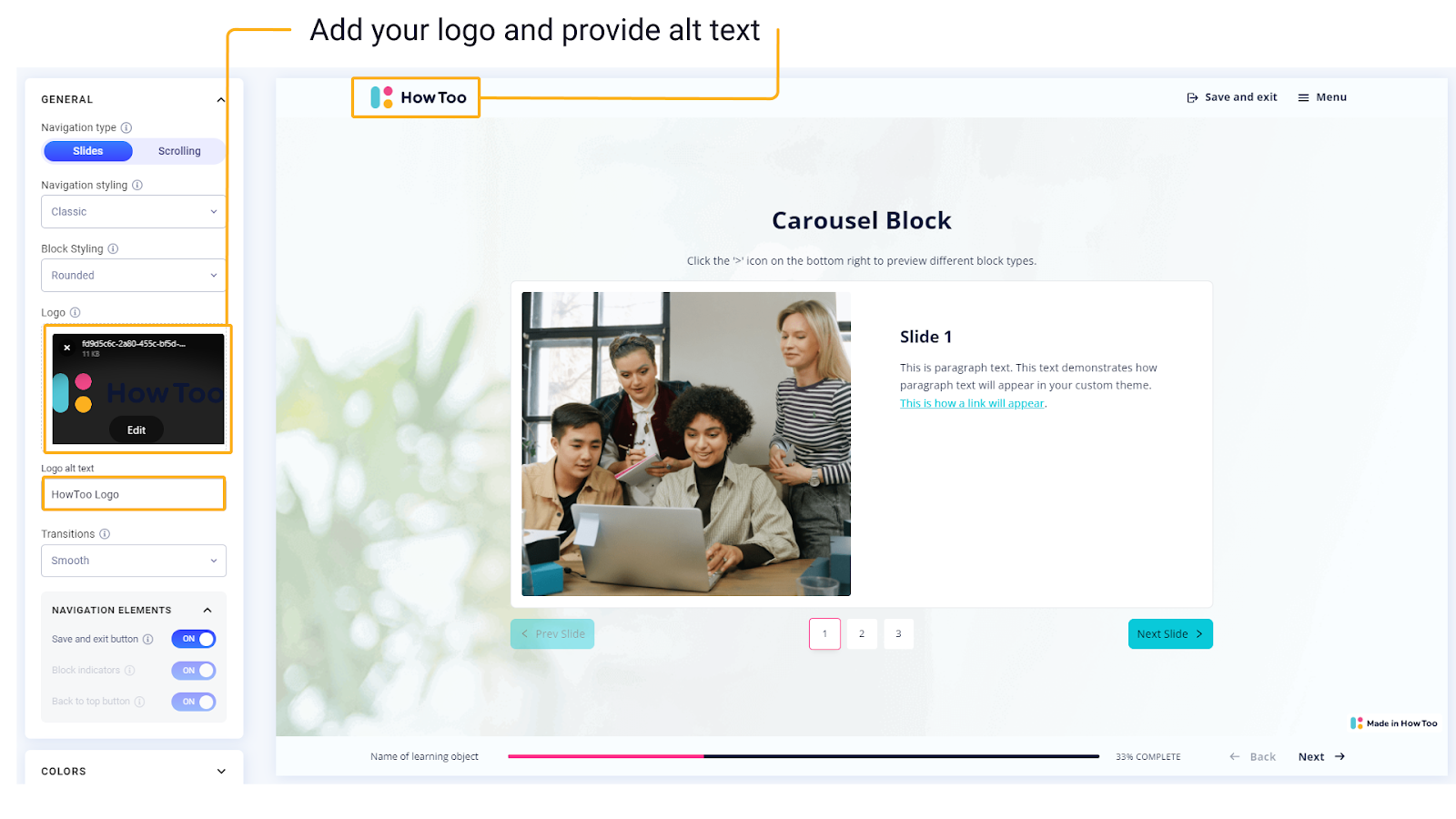 The maximum file size for your logo is 500kb. This is to ensure that your lessons are optimized for online viewing.