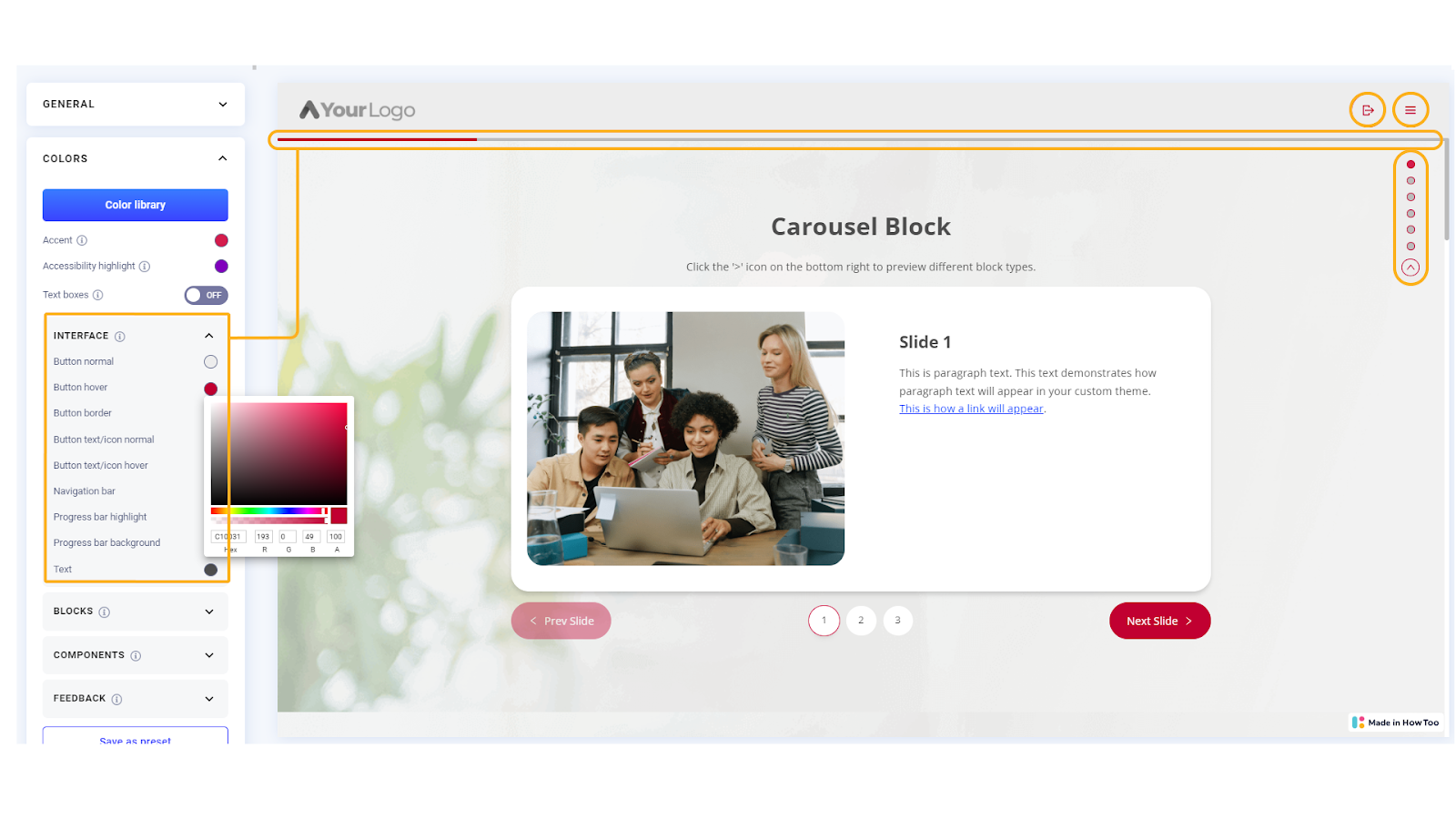 The interface colors apply to any text, buttons, indicators and backgrounds in the navigation or progress bar.