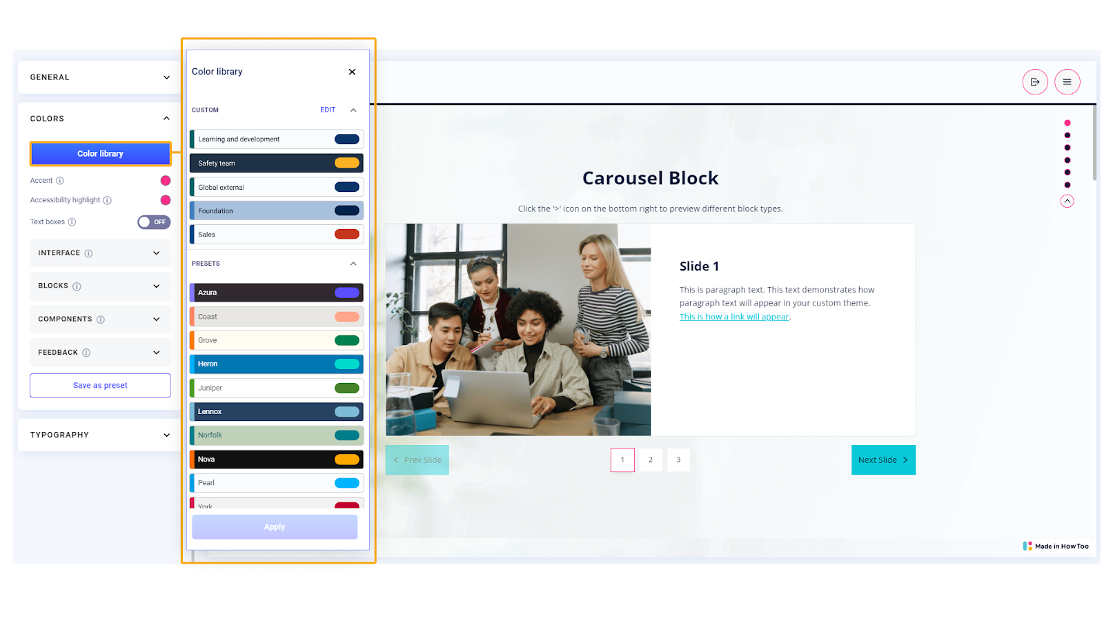The color library includes two main components - Presets provided by HowToo and your saved custom presets. You can apply any preset from the color library to your theme.