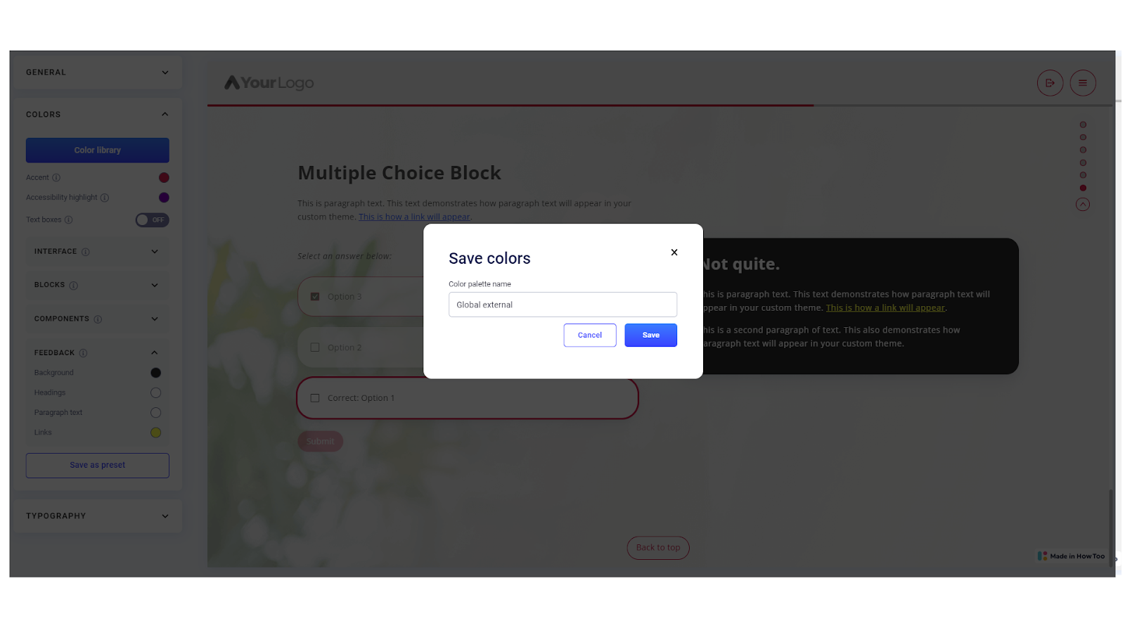 Once you have chosen all the colors for your theme and have checked contrast meets accessibility requirements, select Save as preset, name the palette and select Save. It will then appear in the Color library in the Custom Preset list.