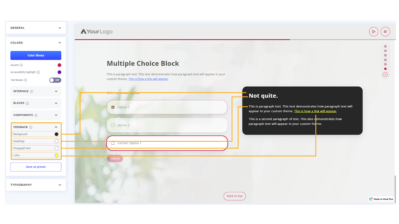 Feedback colors apply to the feedback that appears on any question or rating scale block. Here you can choose a background, text and link color.