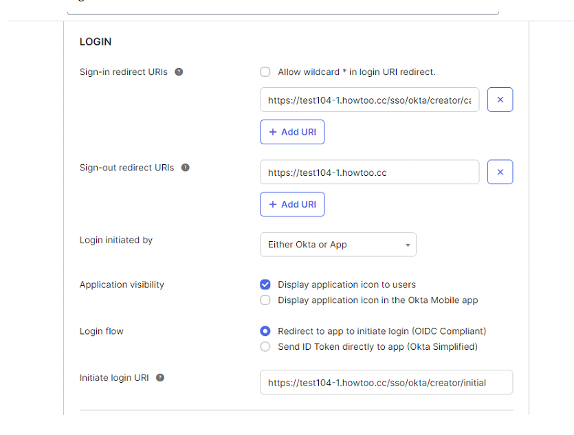 - The sign-in redirect URLs and sign-out redirect URLs can be found in HowToo when configuring your Okta setup. They should look something like https://yourcompany.howtoo.co/sso/okta/creator....