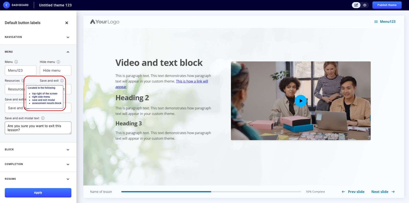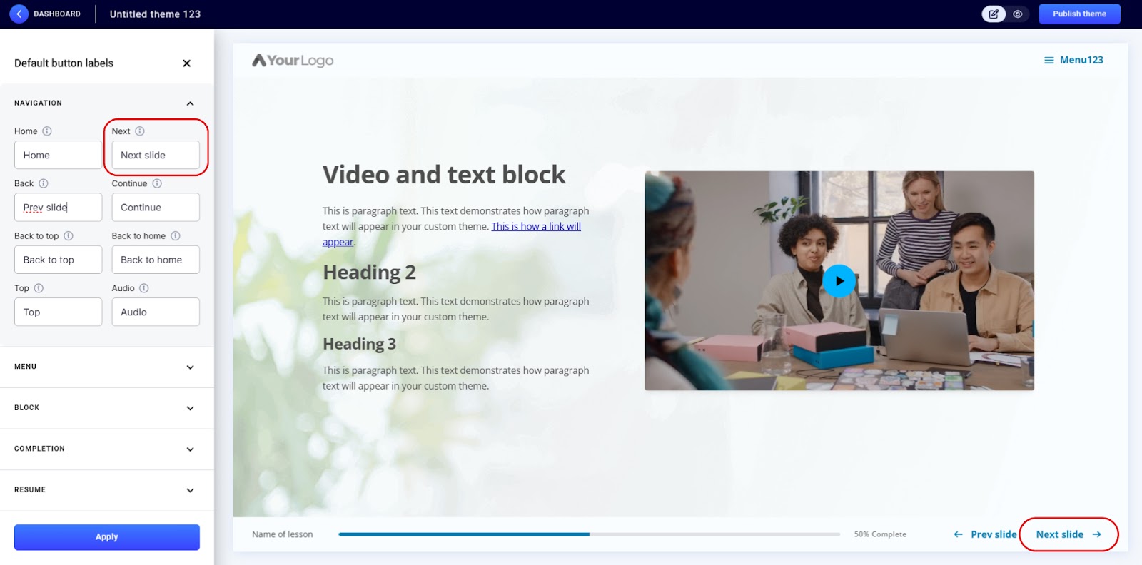 - Publish your theme: To see the updated labels in your lessons, publish the theme and apply it to your lesson.