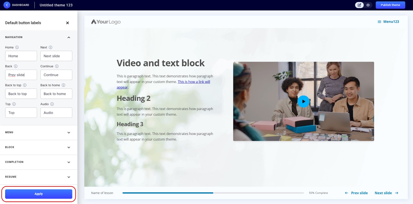 - Click ‘Apply’ to save your changes. When ready, publish your theme to make it available for use.